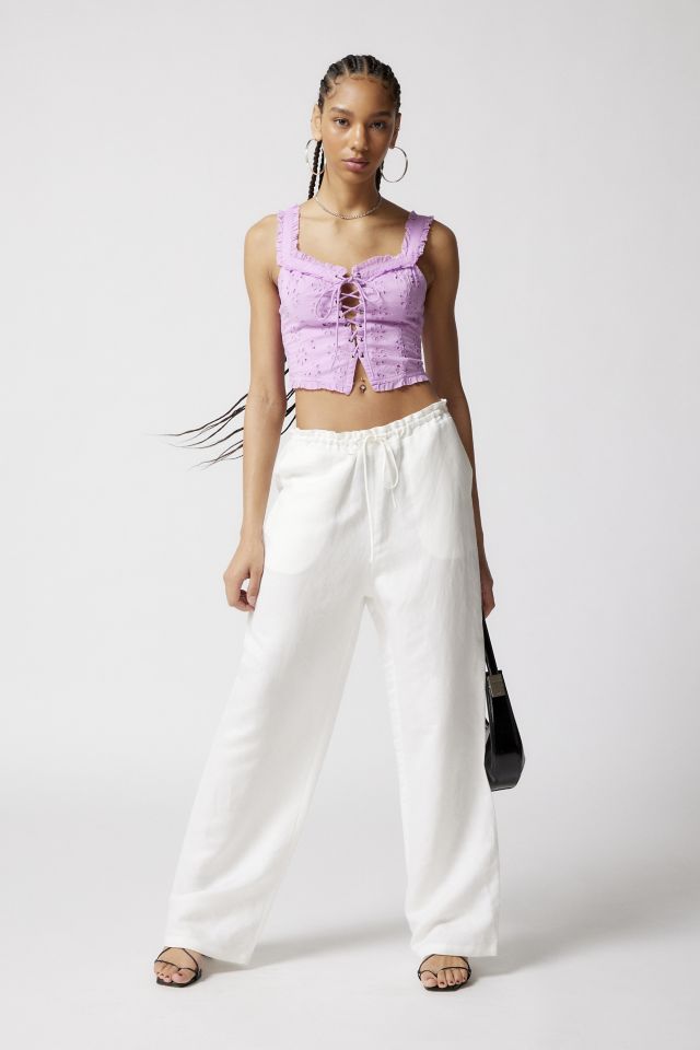 Corset-style top from UO with femme eyelet detailing throughout. Cropped above the waist and fitted with wide straps and a lace-up construction at the front. Topped with ruffle trim at the straps, neckline hem. Only at Urban Outfitters.