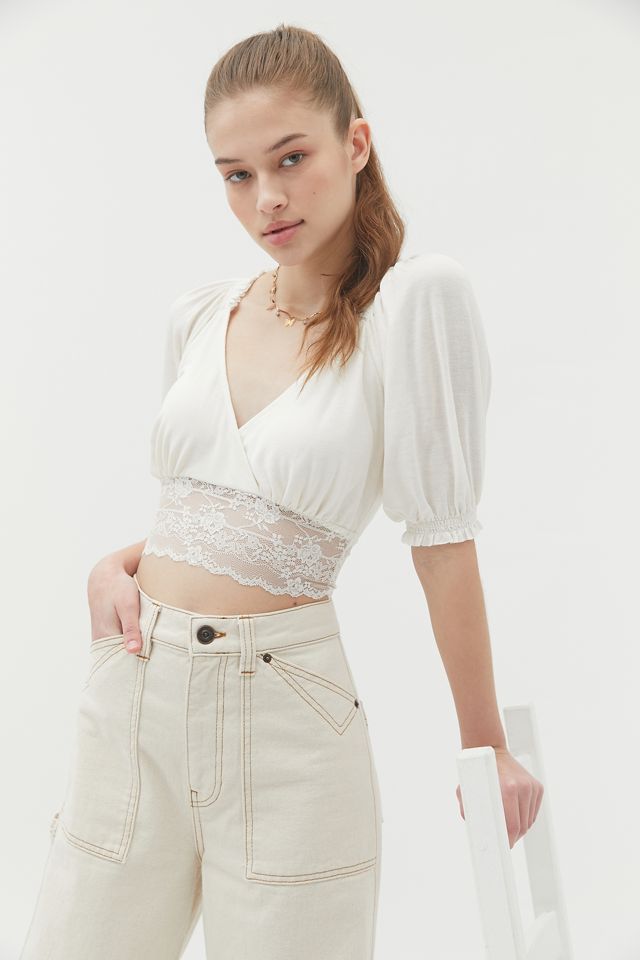 Effortlessly feminine cropped top from UO with romantic details throughout. Features a deep surplice neckline with sheer lace banding at the cropped hem. Fitted with elastic cuffs at the extra-long short sleeves and ruffle trim at the shoulders. Only at Urban Outfitters.