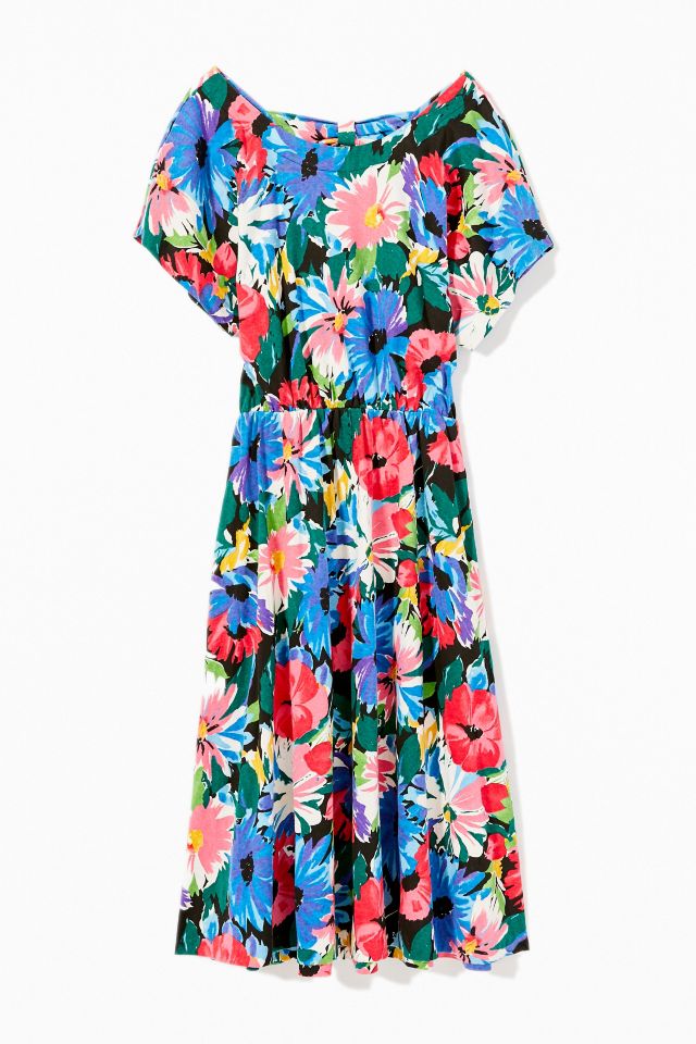 Vintage midi dress with a large floral print – only one is available for purchase by one lucky customer, so get it before it’s gone! Flowy silhouette offers a boat neck with short sleeves and cinched elastic at the waist. Finished with a bow-topped keyhole back and a midi length hem.